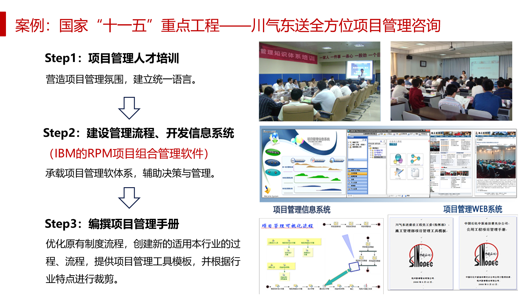 (1)项目管理培训:为川气东送指挥部及各子项目团队提供系统化的项目管理培训,统一项目管理语言,提升整体项目管理能力。